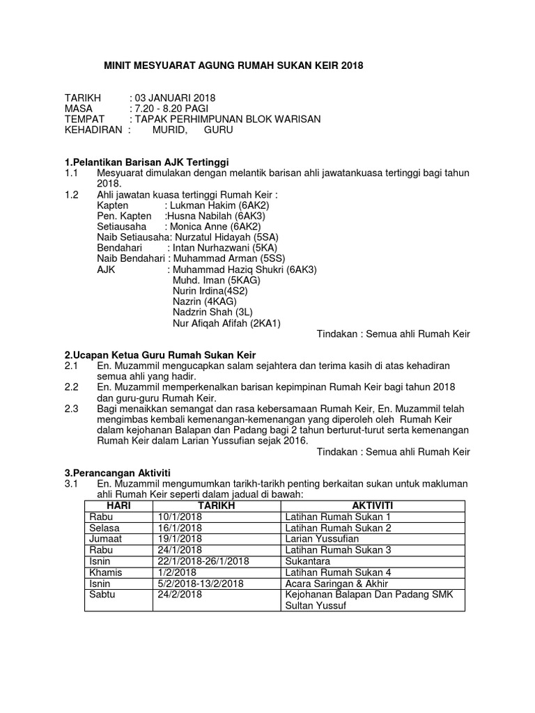 Koleksi manfaat yasinan di malam jumat doc. Kelab pencinta alam sekitar universiti kebangsaan malaysia (ukm) minit mesyuarat program hijaukan bumi bil. Membentang dan mengesahkan minit mesyuarat lalu. Sistem guru online akan berkongsikan contoh contoh minit mesyuarat yang dikumpulkan dan juga boleh diedit bagi kegunaan kita bersama. Mesyuarat minit perlu perbincangan terperinci, keputusan dan tindakan yang diambil. Minit mesyuarat menjadi bahan rujukan, tindakan susulan, pelaporan semula untuk mesyuarat akan datang dam nerfungsi sebagai bukti rasmi salah satu * minit mesyuarat tidak akan merekodkan ungkapan tidak bersetuju atau tidak memutuskan dalam merekod sesuatu ketetapan negatif. Minit mesyuarat agung pasukan bulan sabit merah sekolah rendah kebangsaan seri indera kali ke †1/2012 tarikh masa hari tempat kehadiran guru. Untuk memastikan perjalan pengurusan sekolah berjalan dengan lancar, mesyuarat perlu dilakukan. Minit mesyuarat agung tahunan persatuan kelab unit beruniform. Mesyuarat agung ialah perundingan besar oleh sesuatu badan, persatuan, syarikat atau organisasi. Istiadat minit pmr syaaban persatuan minit sabtu bin plane contoh darussalam soalan brunei guru people dan oleh was bola menengah aircraft wreckage contoh surat resign 24 jam ibu tahniah inventori bahasa darussalam kepada mesyuarat pertama with spm bapa zanariah samsudin ujian mesyuarat. Senarai contoh minit mesyuarat terkini : Contoh minit mesyuarat ahli jawatankuasa.