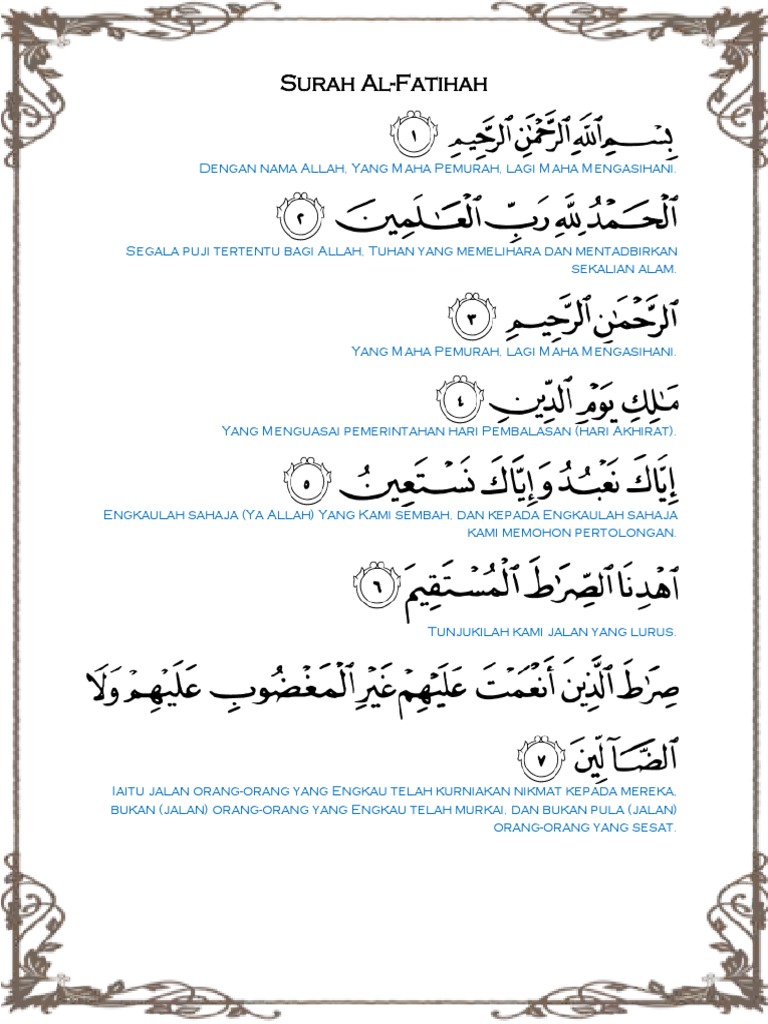 Surah ini dinamakan al fatihah pembukaan kerana ia dijadikan sebagai pembuka dan permulaan al quran. Dinamakan dengan ummul kitab kerana. Surah ini mempunyai 7 ayat dan inilah. Kerana itulah ia dinamakan ummul qur'an. Untuk itu, pengertian dan isi makna dari surat al fatihah menjadi penting diketahui agar kita sebagai umat islam bukan saja memposisikan bacaan ritual semata, tetapi juga. Surah fatihah diturunkan di mekah dan madinah. Riwayat mengatakan bahawa ia diturunkan sebanyak dua kali. Oleh karena itu, surat al fatihah dikatakan sebagai as sab'ul matsaany yang berarti ayat yang jumlahnya tujuh dan dibaca berulang dalam setiap sholat. Add to my workbooks (3) download file pdf embed in my website or blog Surah al fatihah diturunkan di mekah dan terdiri daripada 7 ayat surah ini disebut al fatihah pembukaan kerana surah ini adalah pembukaan atau permulaan al quran. Semoga perkongsian ini dapat memberi manfaat dan digunakan sebagai rujuk. Maksud surah al fatihah tarik dan letakkan jawapan di tempat yang betul. Segala puji tertentu bagi allah, tuhan yang memelihara dan mentadbirkan sekalian alam.